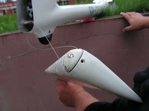 Drugi lot po doważeniu modelu (około 150 gr.) przebiegł spokojniej jeśli nie liczyć wyczepienia na dwa razy i flateru steru kierunku w szybkim locie. Wyprowadzenie z szybkiego lotu wyciągnięciem nie zrobiło specjalnego wrażenia na skrzydłach więc powinny nadal działać prawidłowo. Po usunięciu błędów w zakresie mocowania napędu steru kierunku (sztywniejsza dźwignia serwomechanizmu, doprężenie linek), ustawieniu expo na sterach wysokości, 50 gr. doważenia oraz lepszego wyprofilowania otworu zaczepu haka, model czeka na możliwość dalszych lotów. Na pewno dwa pierwsze loty nie należy traktować jako zakończenie prób w locie. Jeszcze trzeba to rzucić, jak mawia Krzysiek Giesztorowicz.