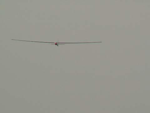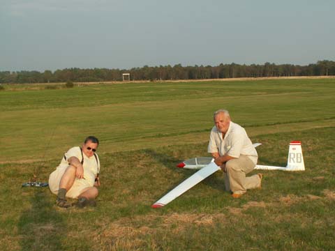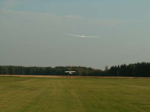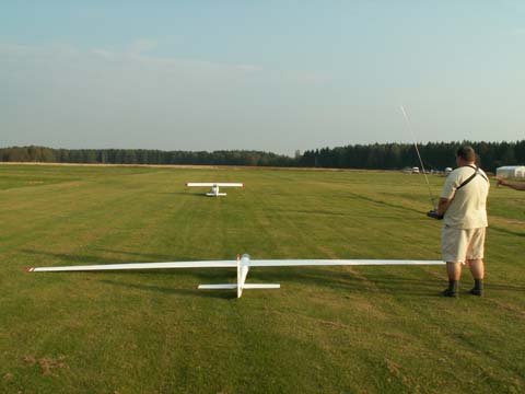 Start bez podtrzymywania końcówki skrzydła ze starannie utrzymanej murawy przebiegł bez najmniejszego problemu. Po około 7 metrach skrzydła już trzymały się powietrza i po nabraniu „oddechu” model leciał. Holownik ma swoją moc, ale te sześć metrów z ogonkiem nie stawia zbyt dużego oporu. Pilot holownika łaskawie oszczędzał nasze nerwy i konstrukcję. Spokojne holowanie przy wiaterku 2 m/sek. Owszem była i „hopka” na dużej wysokości ale to całkiem normalne. Po wczepieniu od razu wyszło niedoważanie modelu - trzeba dokładniej wyważać! Cały lot odbył się na granicy stateczności z wypchniętym trymerem wysokości, wypuszczonych hamulcach i „miętkich” nogach personelu. Trwało to długo, bo pomimo otwartych hamulców model wykazał się sporą doskonałością. Delikatniutkie przyziemienie, "amory" wybrały jakieś drobiazgi w murawie. Poooszło! Pierwsze śliwki - robaczywki jak każdy wie!