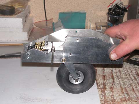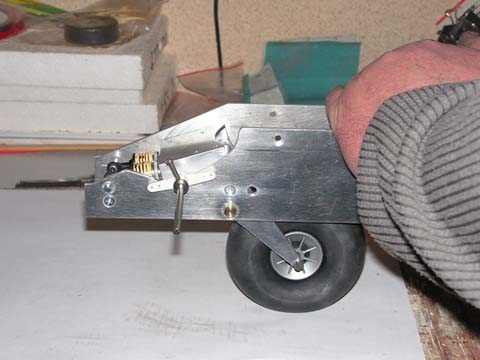 Dość powszechnym widokiem są pałąki zamocowane do goleni podwozia ułatwiające (umożliwiające) zamknięcie pokryw luku podwozia bez ich blokowania na oponie. Działanie jest proste - pokrywy posiadające sprężynowy system zamykania ślizgają się podczas końcowej fazy chowania koła po pałąku a nie blokują się na tępej gumie opony. W ten sposób ruch koła w górę nie jest hamowany zaciskaniem pokryw luku. To prosty i skuteczny sposób. Wadą tego rozwiązania jest możliwość zahaczenie pałąka przy starcie i lądowaniu o wyższą trawę, i w efekcie możliwe uszkodzenia systemu. Nie bardzo mi odpowiadał pomysł z pałąkiem do podwozia Jantara. Poradziłem sobie z zamykaniem pokryw luku podwozia poprzez zastosowanie rolki, wklejonej od wewnętrznej strony pokryw. Rolka toczy się po kole w czasie zamykania podwozia nie powodując dodatkowych oporów. Jako rolka występuje rurka mosiężna 2 mm a w stojak rolki zamienił się stalowy drut 1 mm, widać to na zdjęciu. By było już całkiem po mojemu nie skorzystałem z usług sprężynek przy zamykaniu pokryw ale zastosowałem stary dobry system „2 w 1”. Zawias wykonany z silikonu Elastosil E 41 pełni właśnie rolę sprężyn poprzez dobranie odpowiedniej grubości warstwy silikonu i wklejeniu pokryw w pozycji „nieco do wewnątrz”. Banalne ograniczniki zamykania pokryw dopełniają reszty. Mocowanie mechanizmu podwozia zostało zrealizowane klasycznie - na dwóch wręgach.