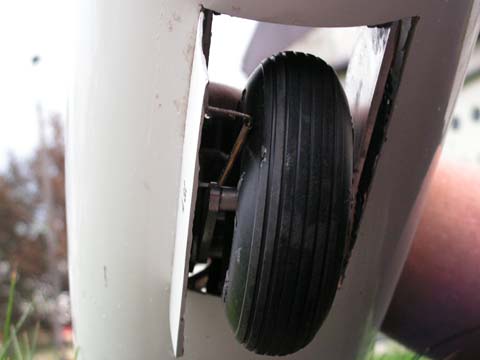 Podwozie główne modelu jest chowane i posiada system amortyzacyjny. Zostało wykonane ono samodzielnie wg. systemu opublikowanygo przez niemieckiego modelarza - Ingo Seiberta. Zastosowałem kilka zmian i usprawnień co do geometrii oraz materiałów zastosowanych w tym mechanizmie. Koło ogonowe piankowe 65x10, koło główne Sulivan 4`` z aluminiowa felgą. Dysponowałem znakomitym kołem Fema 100 mm lecz różnica 32 gramów na korzyść ”Amerykanina” była znacząca dla mechanizmu wykonawczego podczas zamykania podwozia. Koła do dużych modeli to zupełnie osobne zagadnienie.