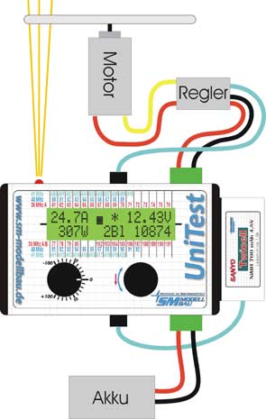 UniTest zostaje włączony pomiędzy regulator i akumulator zasilający. Zasilanie UniTestu następuje przy tym pomiarze albo poprzez BEC regulatora, albo gdy regulator nie ma BEC poprzez akumulator odbiornika. Przed testem należy ustawić ilość łopat śmigła (do pomiaru obrotów). Potencjometrem na UniTeście można w czasie testu regulować obroty silnika. Miernik posiada diodę jako czujnik pomiaru obrotów, na wyświetlaczu (z włączanym podświetlaniem) możemy odczytać: obroty śmigła, natężenie pobieranego prądu (do 70A standard z możliwością podniesienia przez producenta na indywidualne życzenie natężenia do 100 A), napięcie (do 50V), moc wejściową w watach oraz wskaźnikiem belkowym - położenie drążka gazu. Pomiar może być zapamiętany poprzez przyciśnięcie rotary select, by móc zanalizować wyniki pomiaru po wyłączeniu napędu. Na raz może zostać zapamiętanych 20 kompletnych pomiarów, które można za pomocą kabla interface przekazać do komputera. Funkcja pomiaru napędu znakomicie ułatwia jego zoptymalizowanie i przetestowanie.