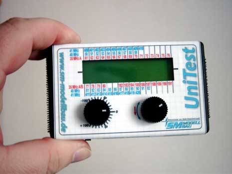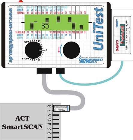 Firma ACT oferuje znakomite odbiorniki działające na zasadzie skanowania i zapamiętywania częstotliwości. Producent UniTest stworzył możliwość podłączenia takiego odbiornika i używania go w połączeniu z UniTestem, jako skanera częstotliwości. Możliwe jest skanowanie pasma 35 MHz (jednocześnie pasmo A i B) oraz przy odbiorniku 40/41 MHz tegoż pasma (pomiędzy 40 i 41 MHz przełączane przyciskiem rotary). Mamy dwie możliwości pokazania na wyświetlaczu pomiaru - jako "przegląd" wszystkich kanałów na raz, oraz w modzie drugim - dla jednego wybranego kanału poziom natężenia pola jest pokazywany w procentach. Jest też możliwość zaprogramowania alarmu dla jednego kanału z wybraniem poziomu sygnału włączającego alarm. W momencie podłączenia odbiornika, skaner działa niezależnie od tego, czy dokonujemy innych pomiarów! Tak więc np. testowanie serwa nie oznacza przerwania kontroli częstotliwości!