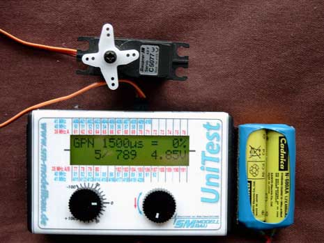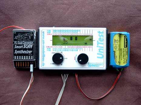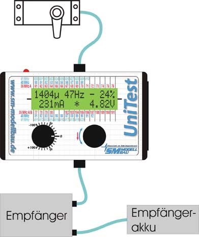 UniTest jest znakomitym, wysoko precyzyjnym cyfrowym testerem serw z jednoczesnym pomiarem napięcia akumulatora zasilającego i prądu pobieranego przez serwo. W celu wyjątkowo precyzyjnego pomiaru, możliwa jest wstępna selekcja serw Graupnera, Futaby czy Multiplexa. Tym samym miernik ma nastawione prawidłowe wartości środkowej i krańcowej pozycji serw. Jednocześnie precyzyjnie zostaje ustawiony odstęp pomiędzy impulsami wynoszący dla GPN - 22 ms przy 45 Hz (PPM, PCM i SPCM); MPX - 25 ms przy 40 Hz i FUT - 14,25 ms przy 70 Hz (dla PCM, Futaba ma dla PPM wartości takie same jak Graupner). Wartości 100% wychyleń, mogą zostać podwyższone do 150%. Jednocześnie mierzona jest szerokość impulsu serwa. Pomiary można, i często warto przeprowadzać na serwach wbudowanych w modelu. Wtedy też można w UniTeście wczytać neutralną w modelu pozycję serwa, by testy mogły być przeprowadzone optymalnie w sytuacji odpowiadającej pracy serwa w modelu. Wartość maksymalnego poboru prądu zostaje zapamiętana i pokazana na wyświetlaczu.