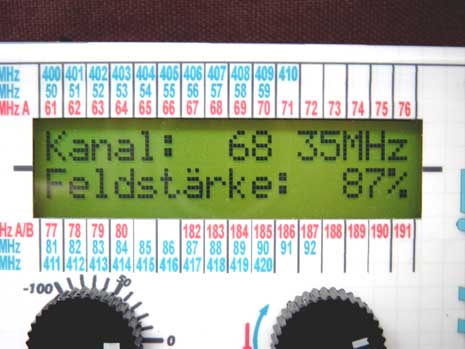 Foto: Piotr Piechowski Wyświetlacz podczas odczytu pojedynczego kanału. Kanał 68 na 35 MHz z natężeniem pola 87%. |