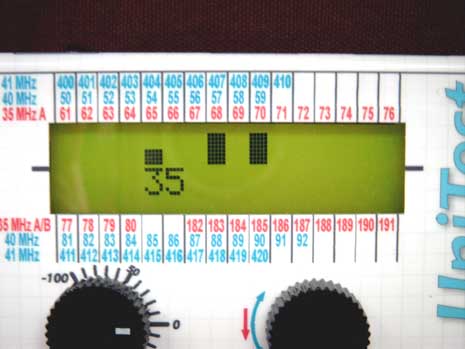 Foto: Piotr Piechowski Wyświetlacz podczas odczytu całego pasma 35 MHz. Cyfry wskazują na częstotliwość skanowanego właśnie pasma. Kanał 68 i 70 jest zajęty i skaner odbiera silne sygnały. Natomiast kanał 65 jest słabszy, ale również zajęty. |