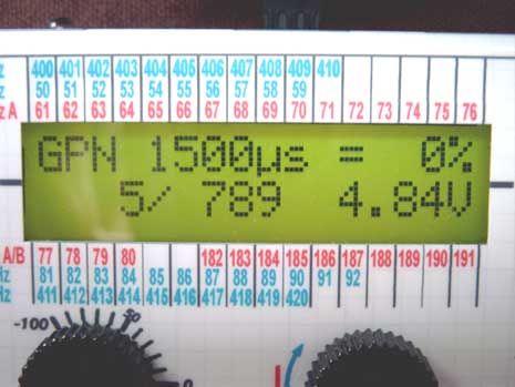Foto: Piotr Piechowski Test serwa Graupnera. GPN = Graupner; 1500 ms = długość impulsu dla pozycji 0% czyli neutralnej serwa. 5 / 789 = 5 mA aktualny pobór prądu, 789 maksymalny zapamiętany w czasie pomiaru pobór prądu; 4,84V - napięcie akumulatora zasilającego. |