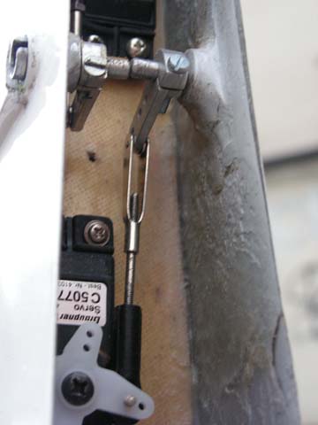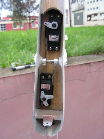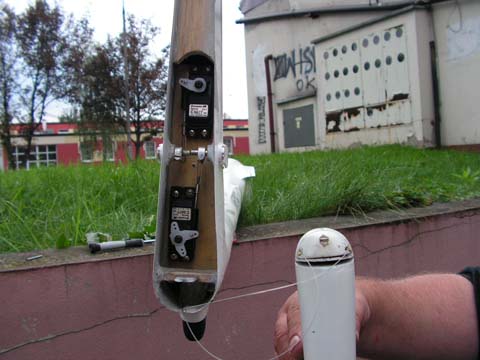 Kolejnym wyzwaniem jest napęd steru kierunku i umieszczenie jego serwomechanizmu. Napęd steru jest linkowy, a mechanizm umieszczony na półce wklejonej do tylnej wręgi służącej do mocowania podwozia. Mocno niewygodna pozycja do jakichkolwiek prac przy linkach. Nic lepszego jednak nie wymyśliłem. Ster kierunku jest demontowany poprzez wykręcenie dwóch wkrętów M3 będących osiami zawiasu, oraz dodatkowego wkręta blokującego tzw. piętkę napędową steru kierunku. Po zdjęciu steru kierunku mamy swobodny dostęp do mechanizmów i torsyjnych (obrotowych) napędów sterów wysokości.