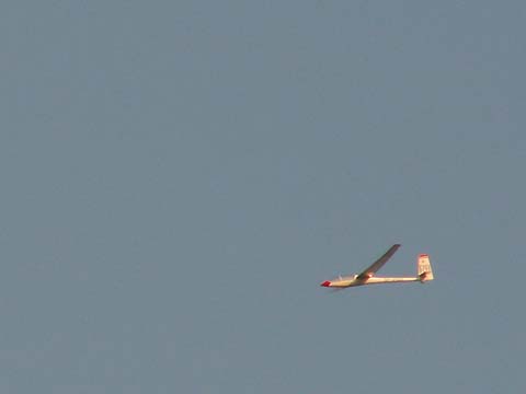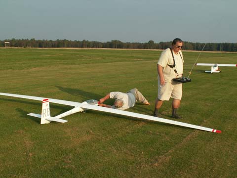 Start bez podtrzymywania końcówki skrzydła ze starannie utrzymanej murawy przebiegł bez najmniejszego problemu. Po około 7 metrach skrzydła już trzymały się powietrza i po nabraniu „oddechu” model leciał. Holownik ma swoją moc, ale te sześć metrów z ogonkiem nie stawia zbyt dużego oporu. Pilot holownika łaskawie oszczędzał nasze nerwy i konstrukcję. Spokojne holowanie przy wiaterku 2 m/sek. Owszem była i „hopka” na dużej wysokości ale to całkiem normalne. Po wczepieniu od razu wyszło niedoważanie modelu - trzeba dokładniej wyważać! Cały lot odbył się na granicy stateczności z wypchniętym trymerem wysokości, wypuszczonych hamulcach i „miętkich” nogach personelu. Trwało to długo, bo pomimo otwartych hamulców model wykazał się sporą doskonałością. Delikatniutkie przyziemienie, "amory" wybrały jakieś drobiazgi w murawie. Poooszło! Pierwsze śliwki - robaczywki jak każdy wie!